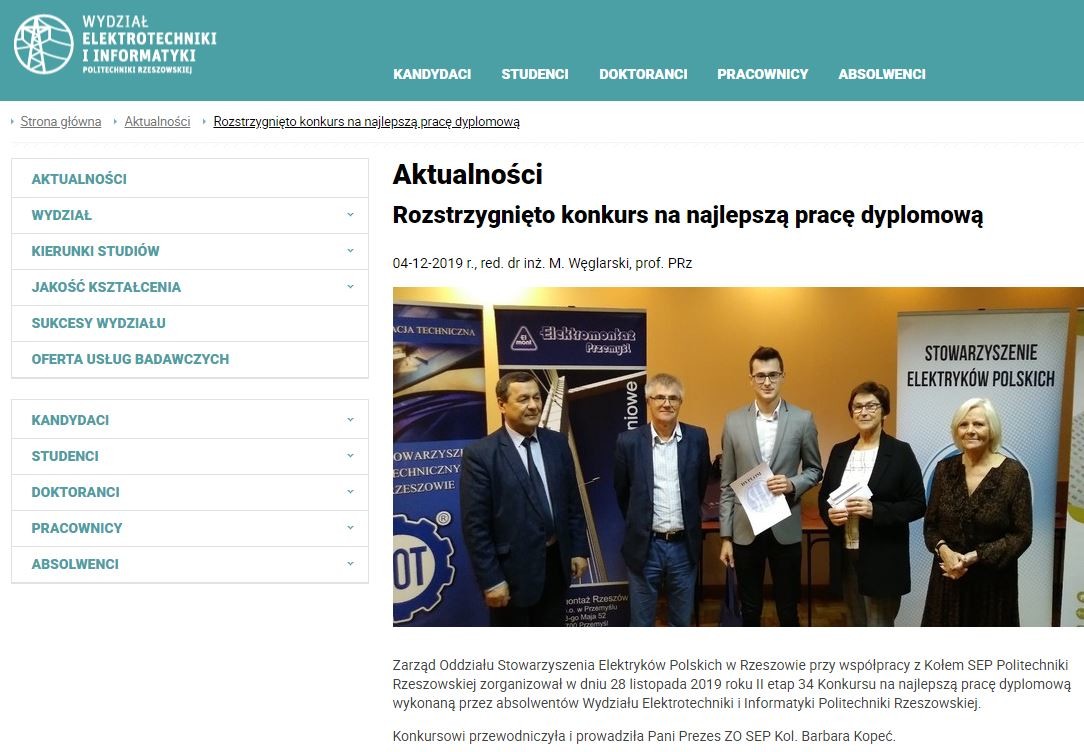 Finał 34. Konkursu Stowarzyszenia Elektryków Polskich na najlepszą pracę dyplomową Wydziału Elektrotechniki i Informatyki Politechniki Rzeszowskiej odbył się w dniu 28 listopada 2019 roku. Wyselekcjonowani na wcześniejszym etapie absolwenci studiów I i II stopnia przedstawili Komisji Konkursowej wyniki swoich projektów, w krótkiej 10 minutowej prezentacji.